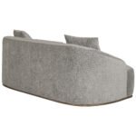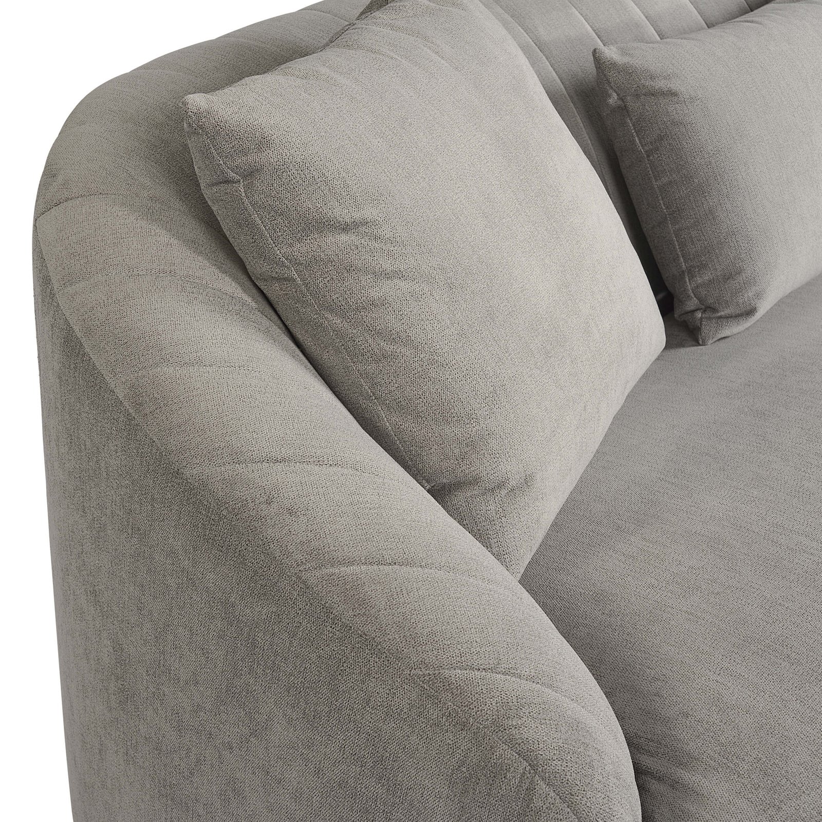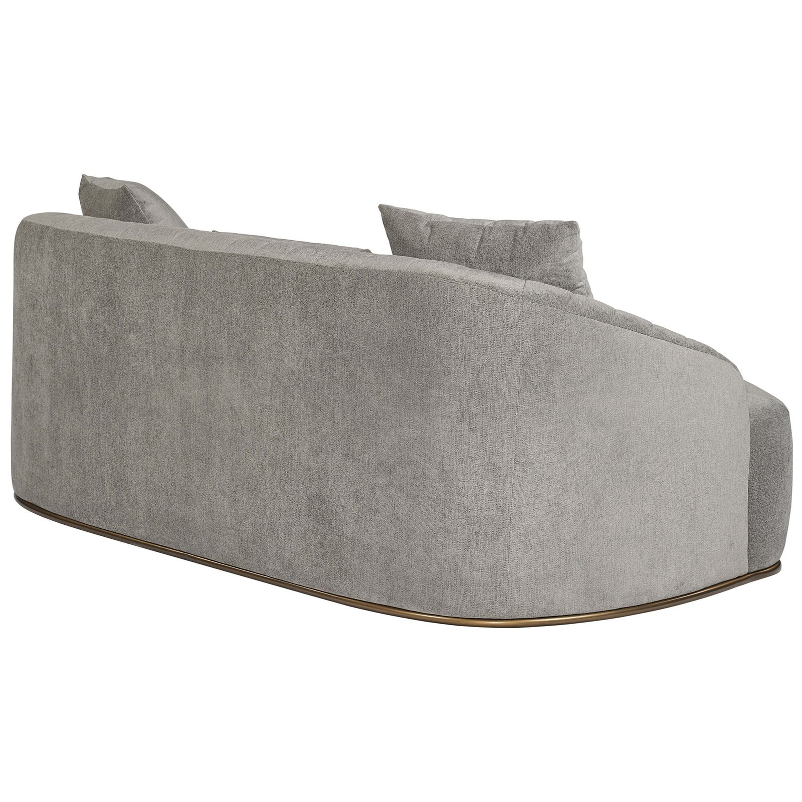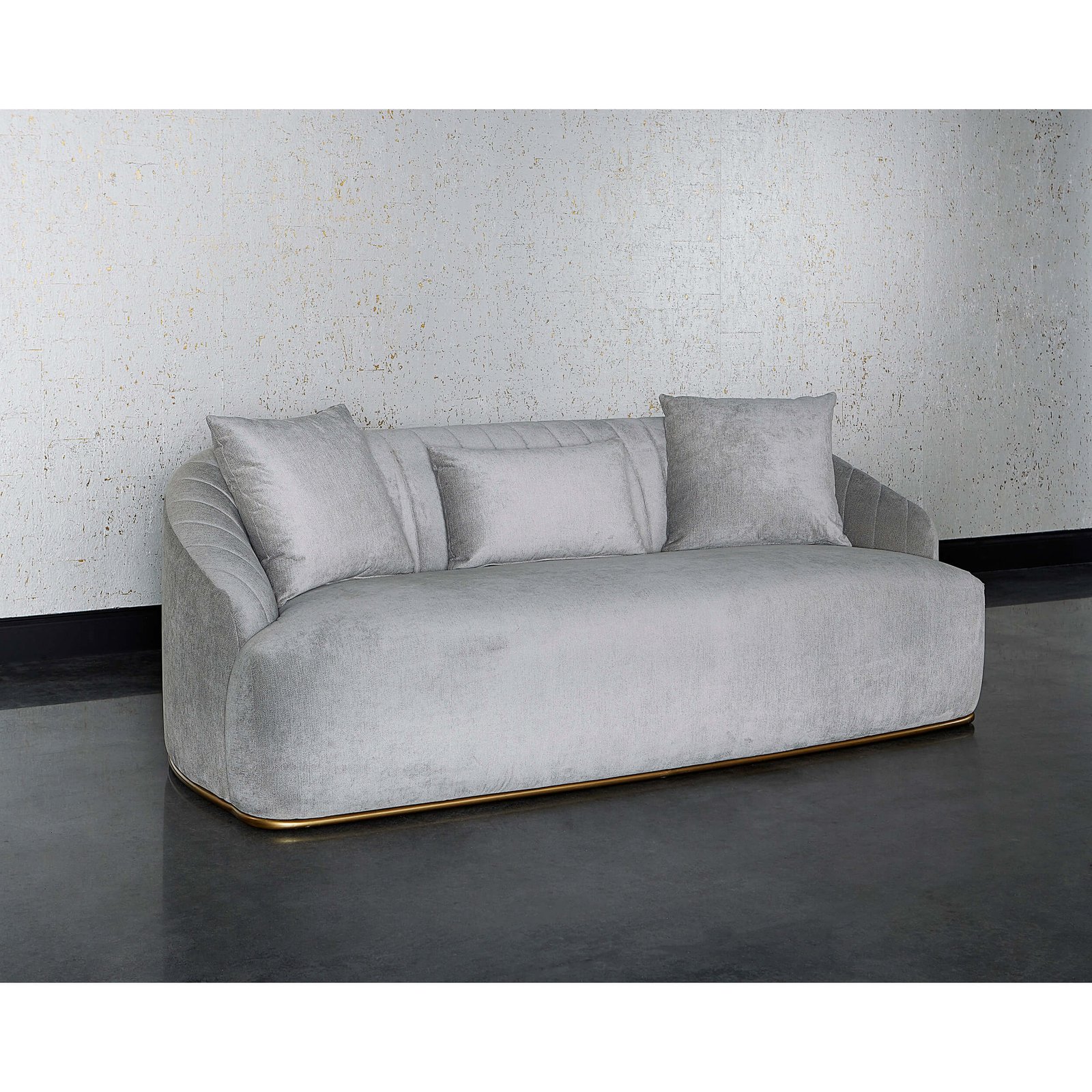 The beautiful lines of this sofa will make a bold and comfortable statement in any space. Features a curved seatback with channel tufting in polo club stone performance fabric. Finished with an antique brass steel frame.