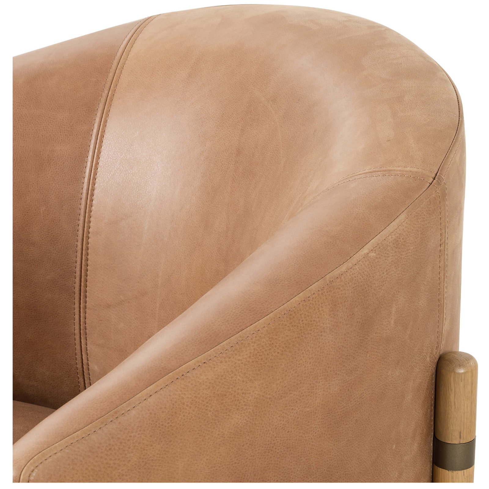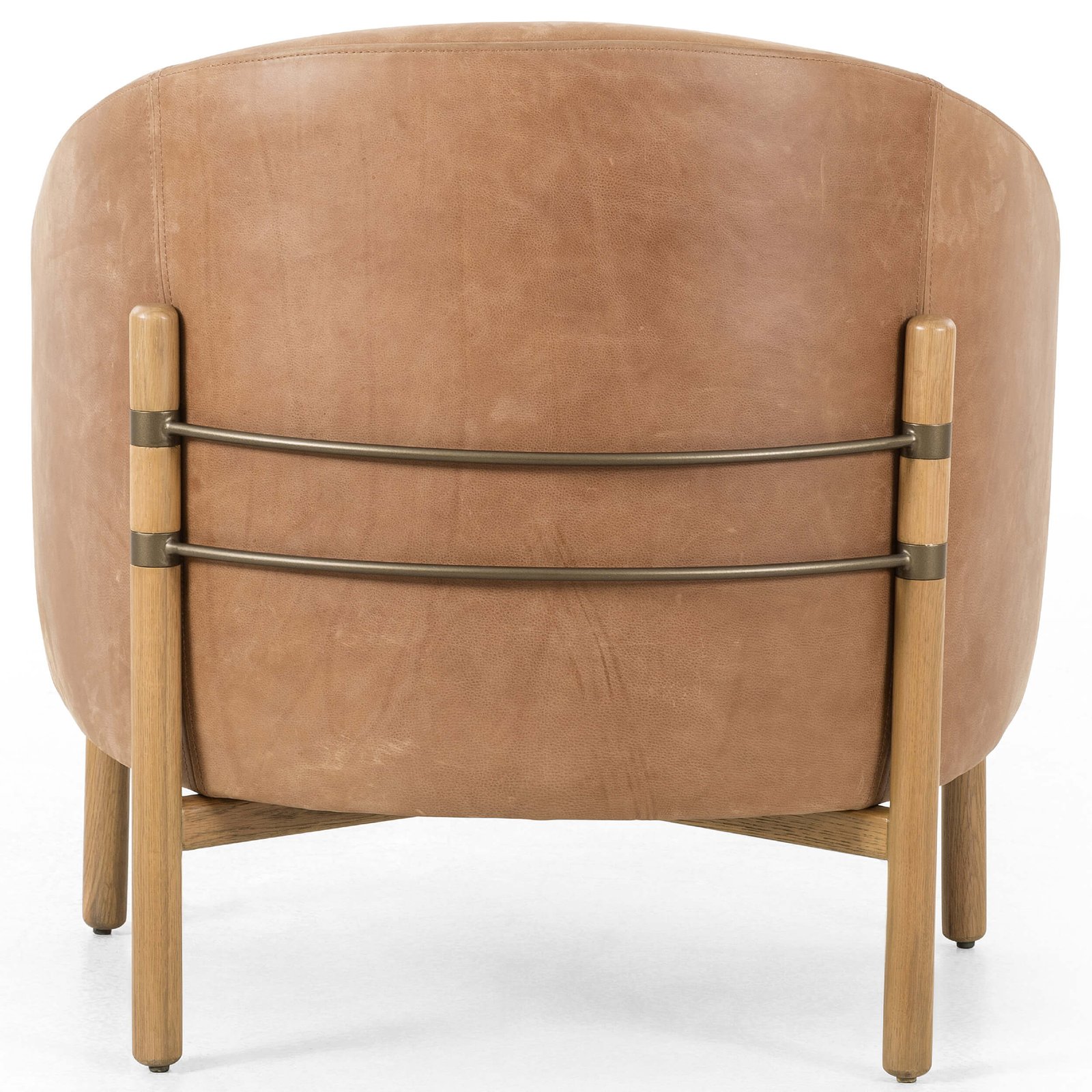 Sensibly elegant. Top grain leather, traditional barrel back seating with a subtle wing silhouette cradles into solid oak framing, with rear iron stretchers adding a thoughtfully modern touch.