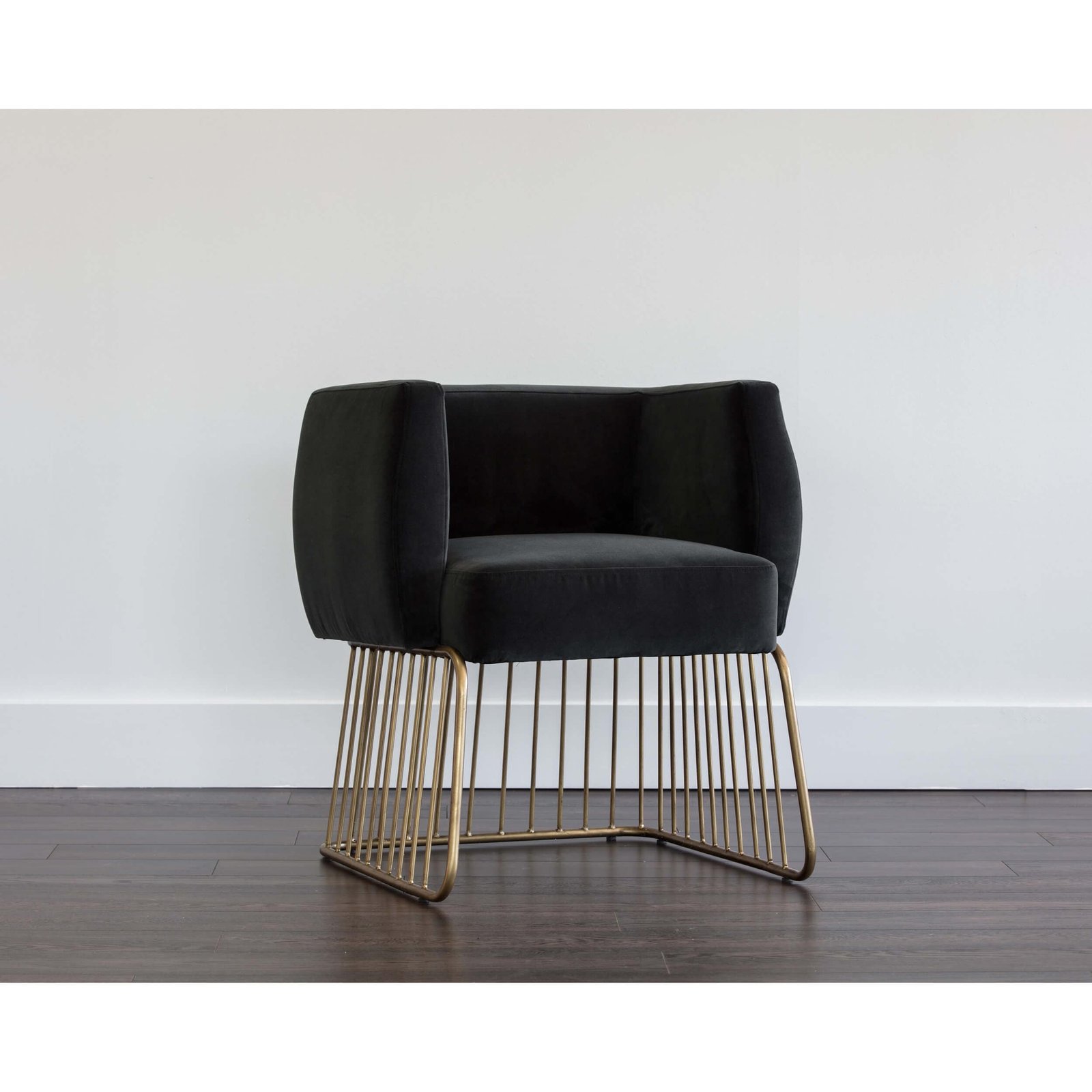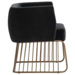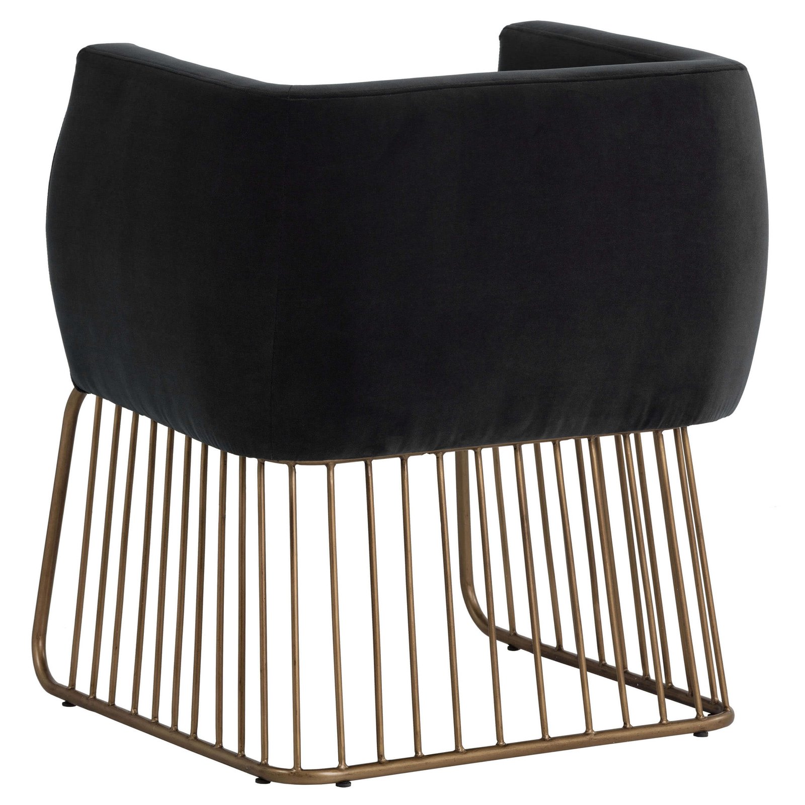 Rustic and modern charm come together in this dining chair. Stocked in our soft shadow grey fabric with a comfortable seat and unique brushed antique brass cage-style base. Perfect for dining, lounge and office spaces.
