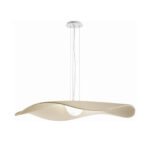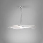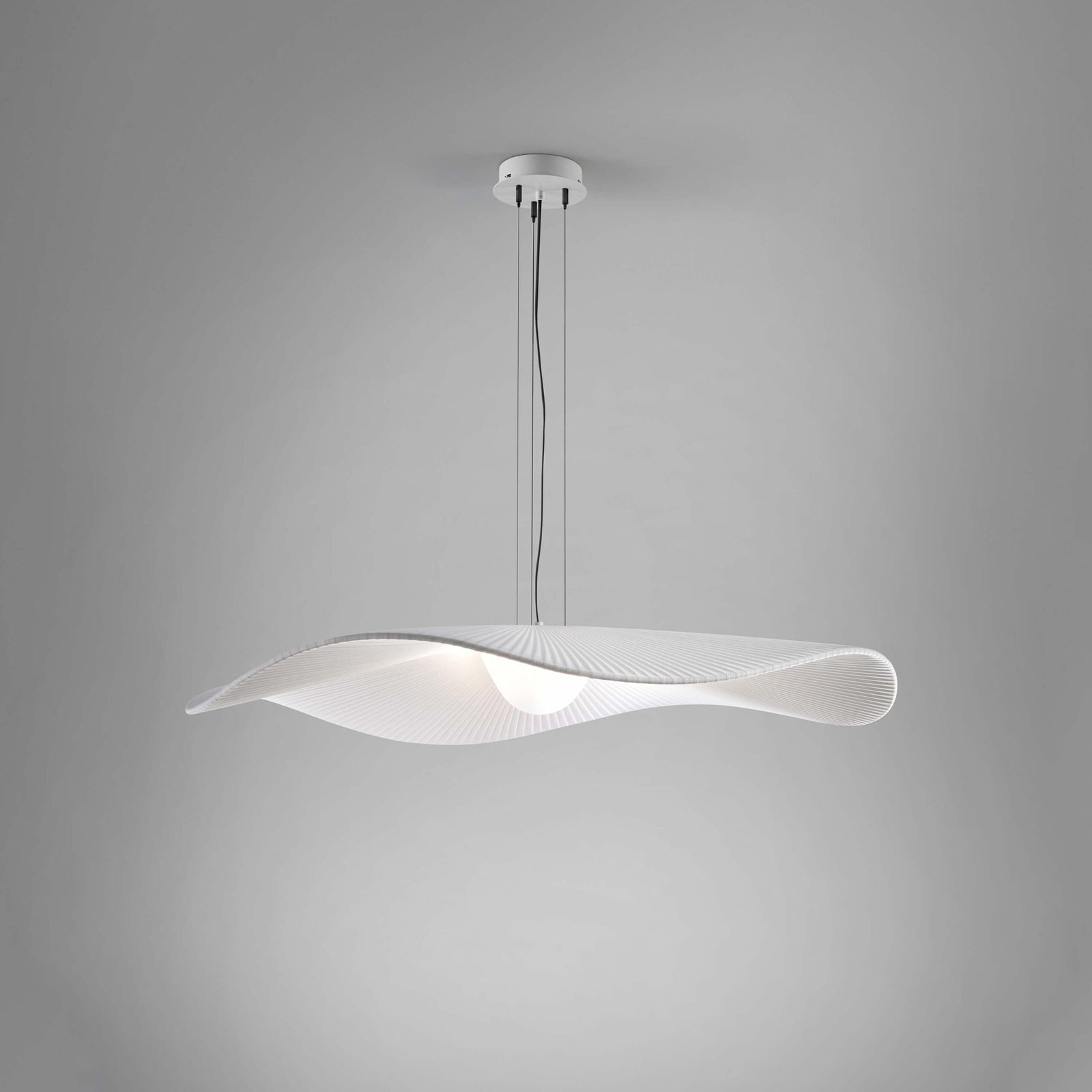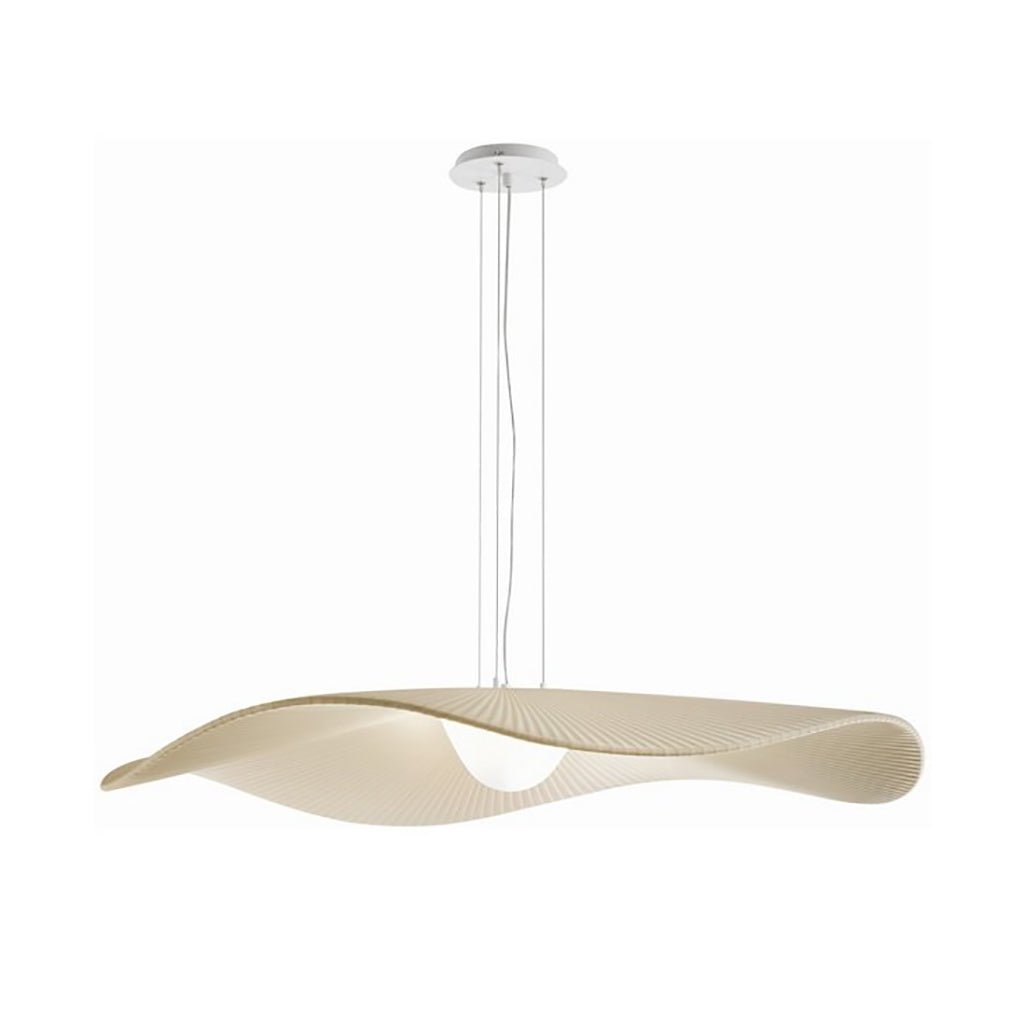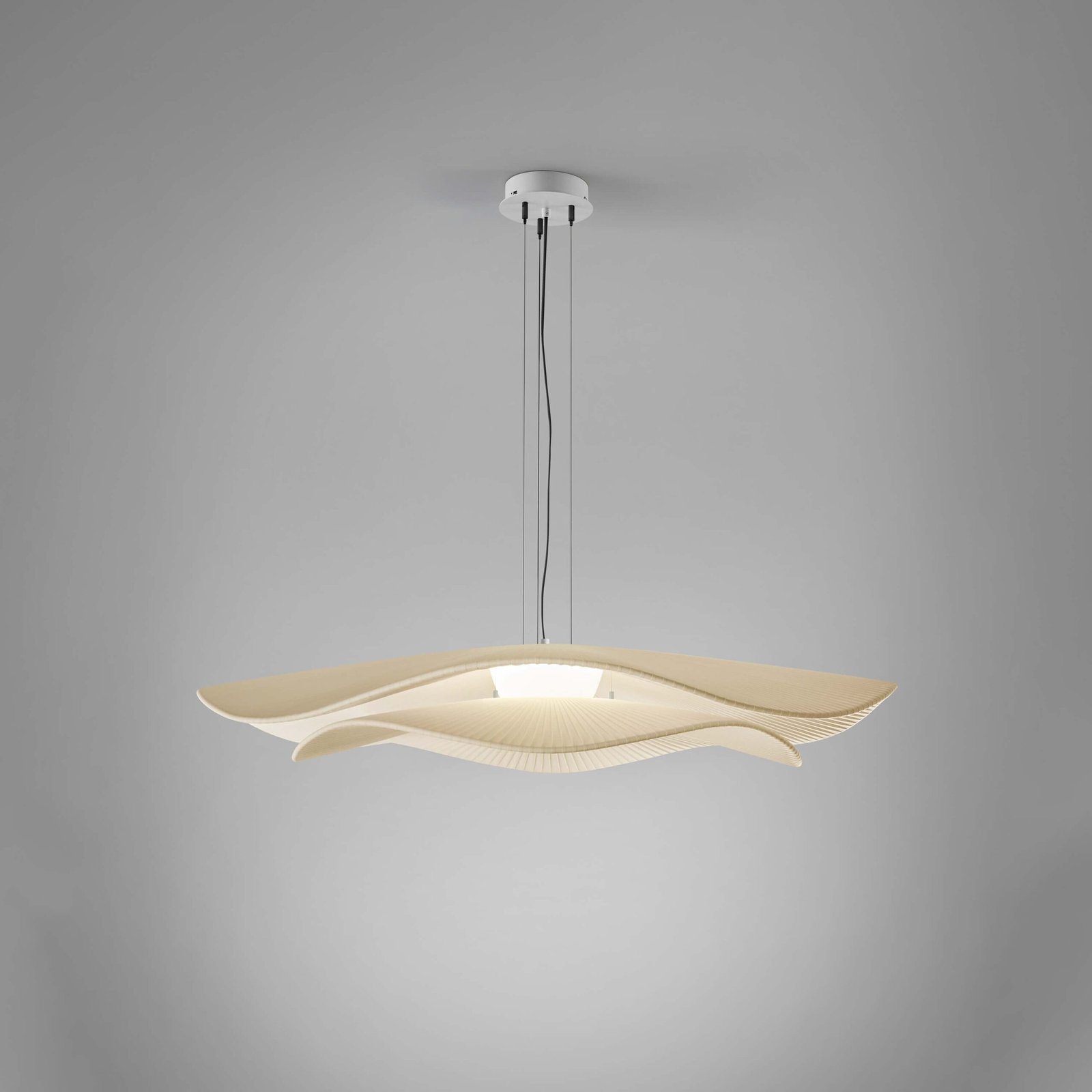 A stunning fusion of natural and industrial elements, the Mediterrania Pendant Light from Bover creates unmatched visual impact in any interior. Crafted in 2019 by Alex Fernandez Camps, its elegant design features a curving fabric shade delicately draped over an iron and aluminum frame. Reminiscent of a pearl nestled in a shell, the powerful LED lighting emits bright, direct beams, creating a luminous and sophisticated ambiance.